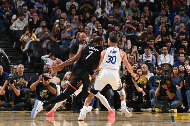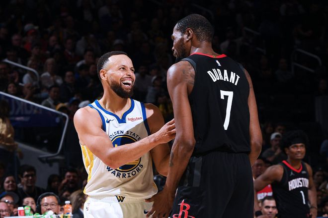 下半场,库里率队打出一波11-0,期间包括一次非常出色的2+1。他持球选择单挑杜兰特,背后运球想要过掉杜兰特但没有成功,然后拉回靠着一个拜佛成功过掉杜兰特的防守,虽然申京及时补防,但库里提前一步选择抛投终结,打进还有加罚!坐在地板上的库里做出了熟悉的肩膀抖动的动作,这一刻我们知道,那个熟悉的库里回来了。第三节,库里单节得到了11分,不过勇士队还是落后。因为库里的老队友,也是老对手杜兰特做出了出色的回应,后者单节16分,库里的每一次进攻,或者说勇士队的每一次进攻他都能回应上。
